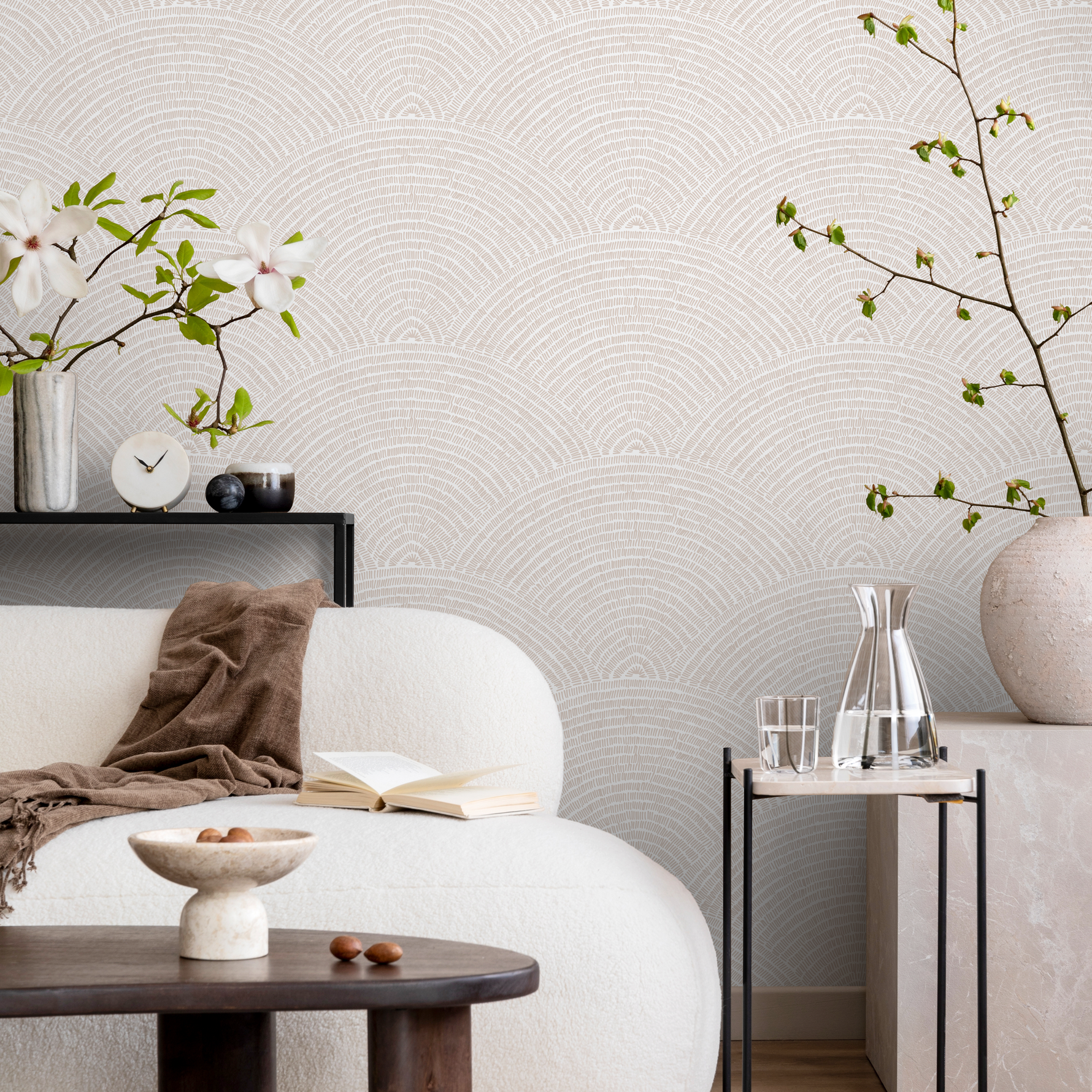 Introduce a touch of subtle elegance to your home with our Geometric Wallpaper, featuring a delicate scalloped arch motif. This sophisticated design, presented in a calming beige and white color palette, offers a minimalist yet impactful way to enhance your interior design. The intricate, hand-drawn-like texture of the arches adds depth and character, creating a serene and modern atmosphere perfect for any space seeking a refined update.