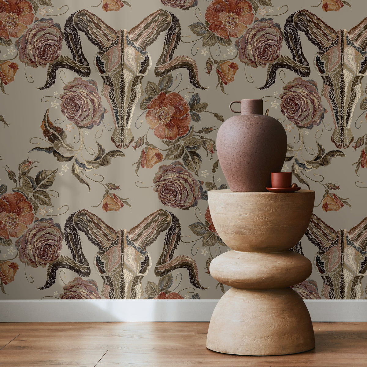 Introduce a bold and captivating aesthetic with our Gothic Wallpaper, featuring a unique embroidered goat skull and floral motif. This stunning wall art masterfully blends vintage floral elements with dark, rustic charm, showcasing intricate details in rich rust and brown tones against a sophisticated beige background. Perfect for creating a dramatic focal point, this design adds depth and character to any interior design project, making it a standout choice for those seeking unconventional elegance.