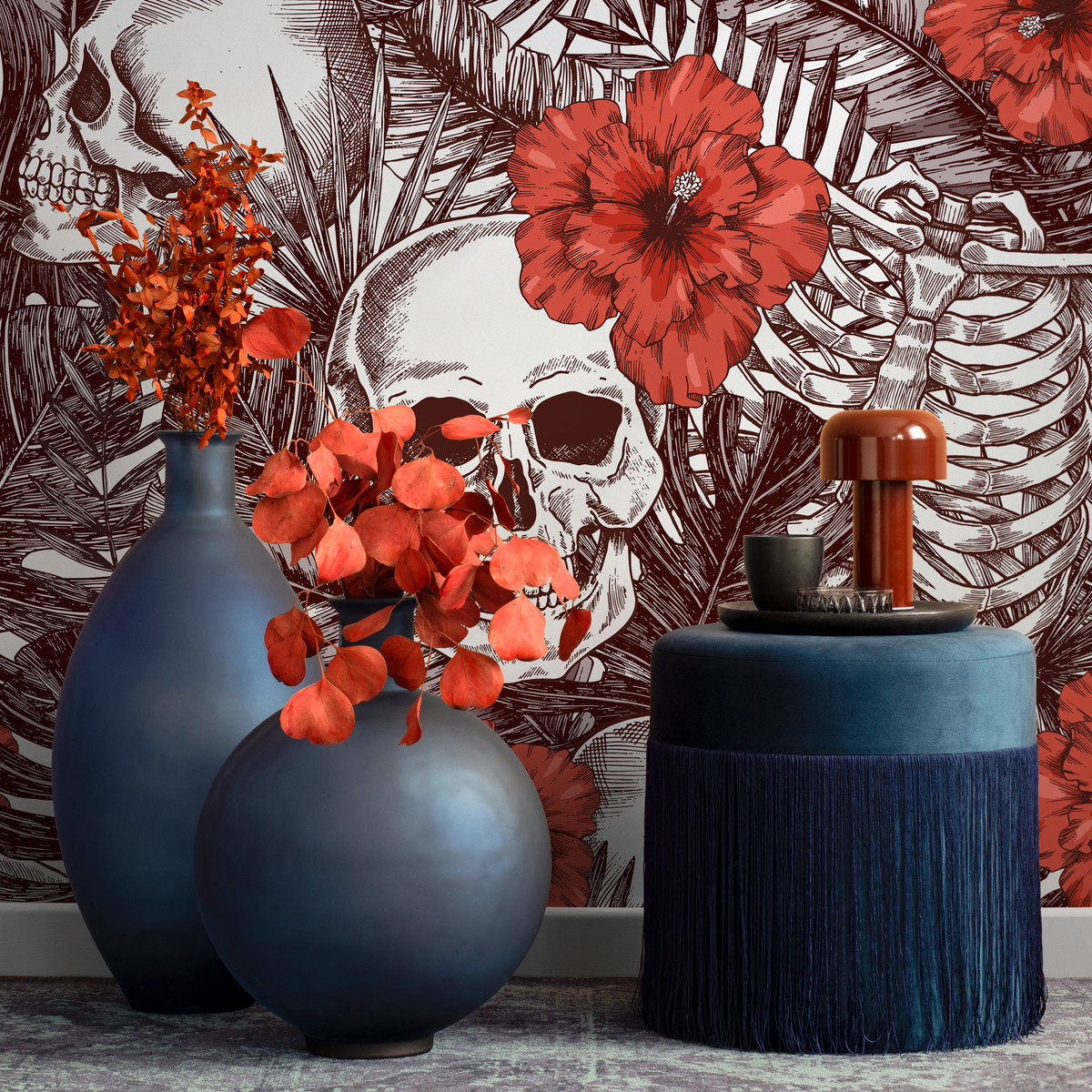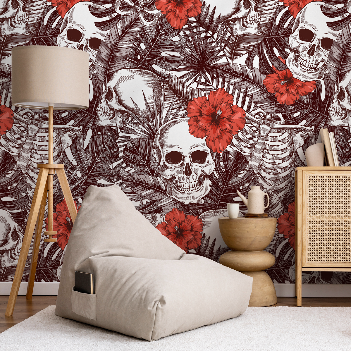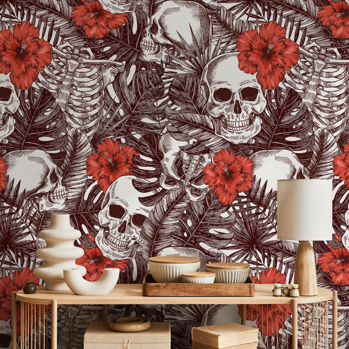 Unleash a bold and dramatic aesthetic with our Gothic Wallpaper, a captivating choice for your home decor. This unique design features intricately detailed tropical skulls and skeletons intertwined with lush monstera leaves and striking red hibiscus flowers. The rich brown and red color palette creates a stunning contrast, making this wallpaper an unforgettable piece of wall art. Perfect for those looking to infuse their interior design with a touch of the macabre and tropical elegance, it transforms any room into a statement space.