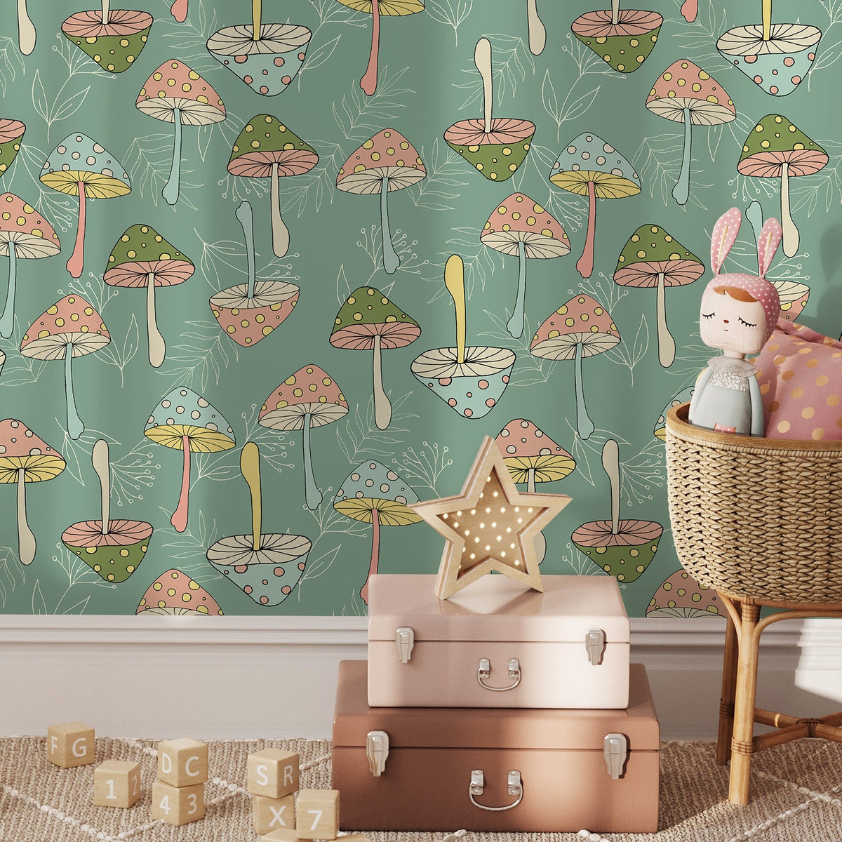 Transform your walls with our Groovy Wallpaper, featuring a retro mushroom motif in charming shades of green, pink, and blue. This delightful wall art captures a whimsical, hand-drawn aesthetic, perfect for adding a touch of nature-inspired nostalgia to your home decor. The unique design brings a playful yet stylish feel to any interior design project.