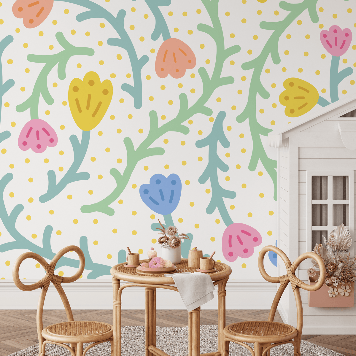 Brighten any room with our Kids Wallpaper, featuring a delightful design of abstract flowers and dots. This charming wall art, with its cheerful palette of yellow, blue, and pink, is perfect for creating an imaginative and joyful atmosphere in a nursery, playroom, or child's bedroom. The whimsical floral motif serves as a beautiful backdrop, turning any wall into a stunning piece of home decor that inspires creativity and fun.