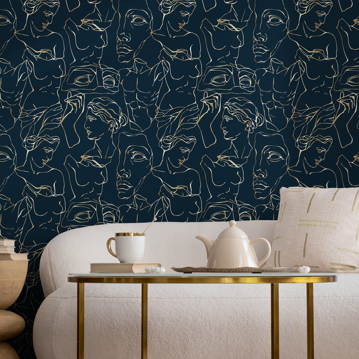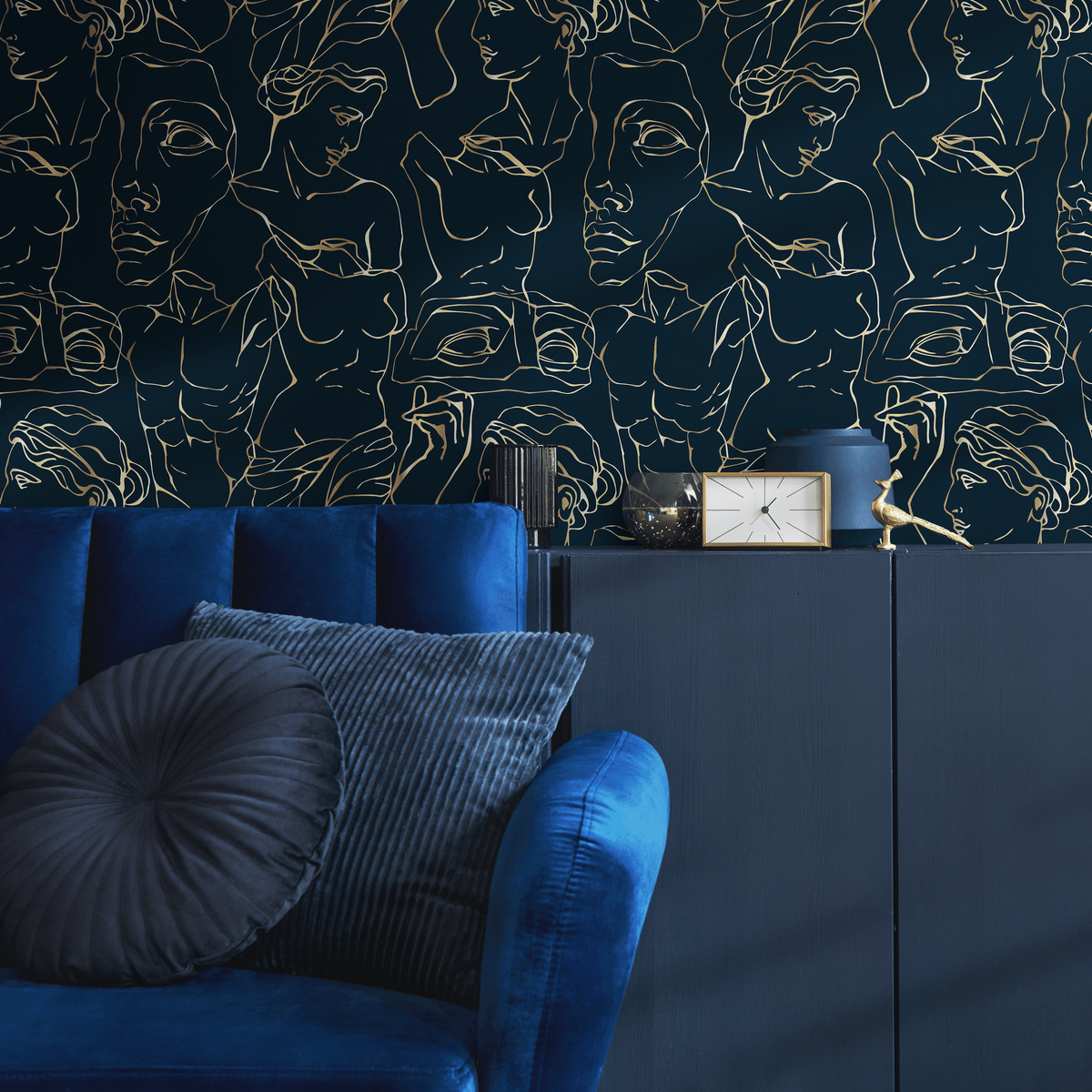 Introduce a touch of timeless elegance with our Line Art Wallpaper, featuring classical Greek figures in a sophisticated Navy and Gold palette. This stunning design transforms any room into a modern art gallery, creating a dramatic and refined focal point. The intricate gold line work flows across a deep navy background, making this wallpaper an ideal choice for creating a statement wall that speaks to both classical art and contemporary interior design trends.