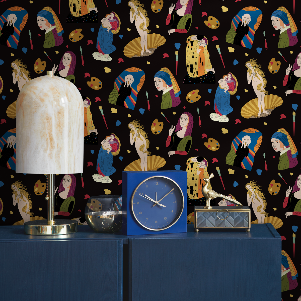 Transform your home with our unique Modern Art Wallpaper, featuring a classical art collage in striking black, gold, and blue. This design is perfect for art lovers looking to make a statement, showcasing iconic masterpieces like the Mona Lisa and The Kiss in a bold, repeating pattern. It's an ideal choice for creating an artistic and sophisticated accent wall or for adding a touch of culture to any room's interior design.