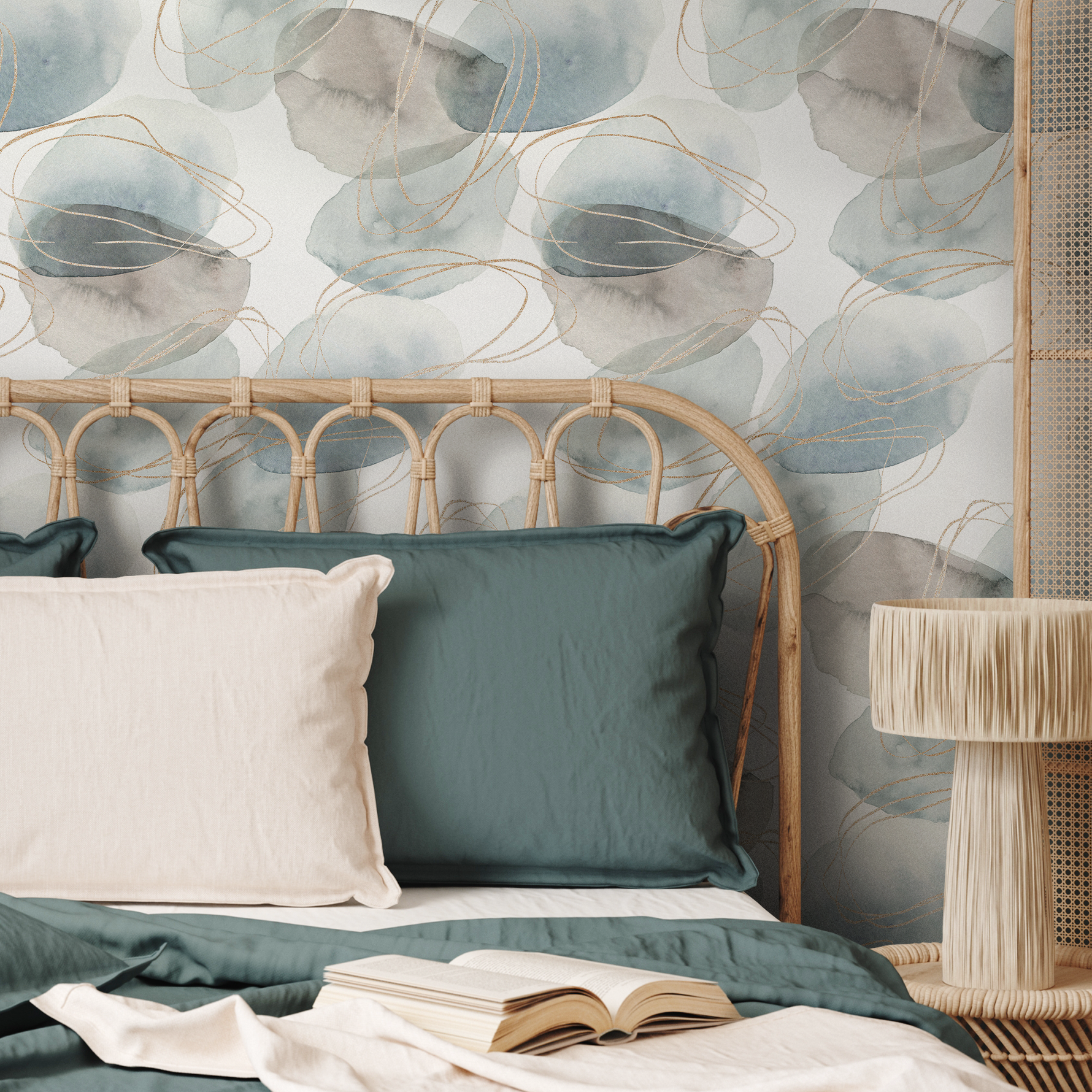 Introduce a sense of calm sophistication to your home with this Abstract Wallpaper, featuring soft watercolor orbs and delicate gold lines. The elegant design, rendered in serene shades of blue and gray, creates a tranquil and modern atmosphere perfect for any interior design project. This stunning wall art serves as a captivating focal point, effortlessly elevating your space from ordinary to extraordinary. Transform your home decor with our user-friendly peel and stick wallpaper. This removable wallpaper is designed for a simple, mess-free application, making it an ideal solution for a quick room makeover. Whether you're creating an abstract wall art feature in your living room or adding a peaceful touch to a bedroom, this wallpaper offers a versatile and stylish update. It's the perfect choice for anyone looking to enhance their home with unique and high-quality wall prints. Our commitment to quality ensures a superior product, printed with advanced, water-based technology for vibrant, consistent color and exceptional scratch resistance. The durable, thicker material simplifies installation and guarantees over 10 years of beauty. Made in the USA with non-toxic, VOC-free inks, this wallpaper is a safe and sustainable choice for your home, providing both style and peace of mind.