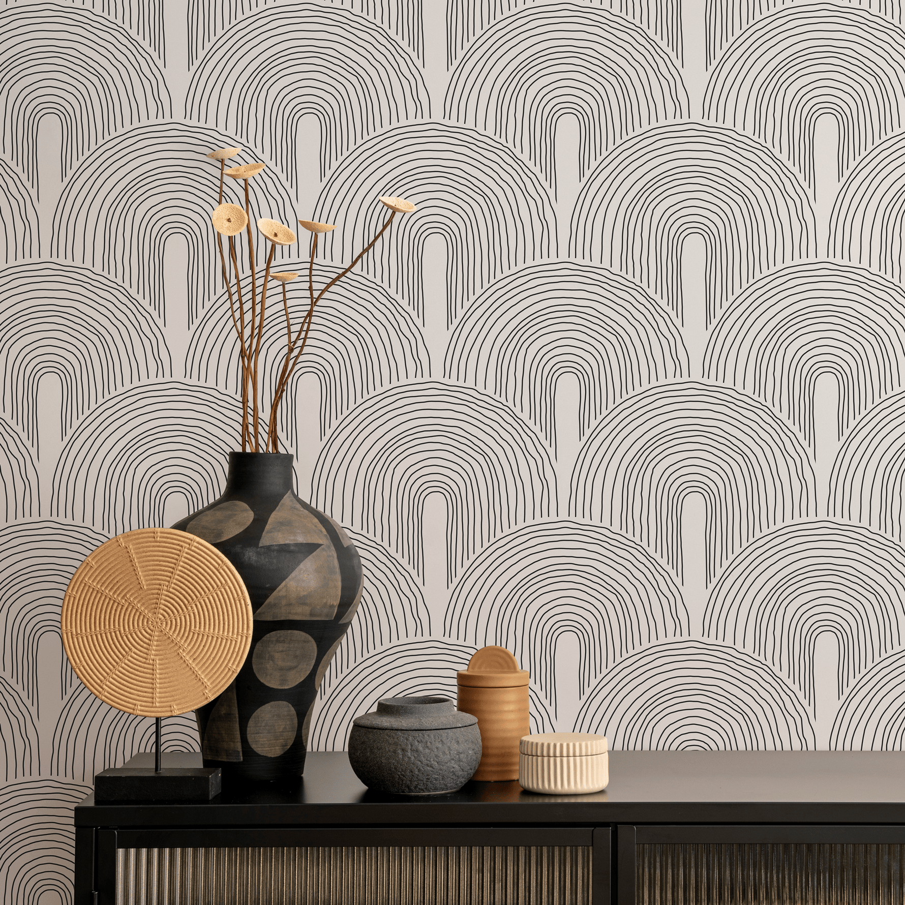Introduce a touch of modern minimalism with our Abstract Wallpaper, featuring a captivating pattern of hand-drawn arches in classic black and white. This stunning wall art is designed to elevate your interior design, creating a sophisticated and contemporary atmosphere. Perfect for making a statement, this wallpaper transforms any room from ordinary to extraordinary with its clean lines and organic feel.