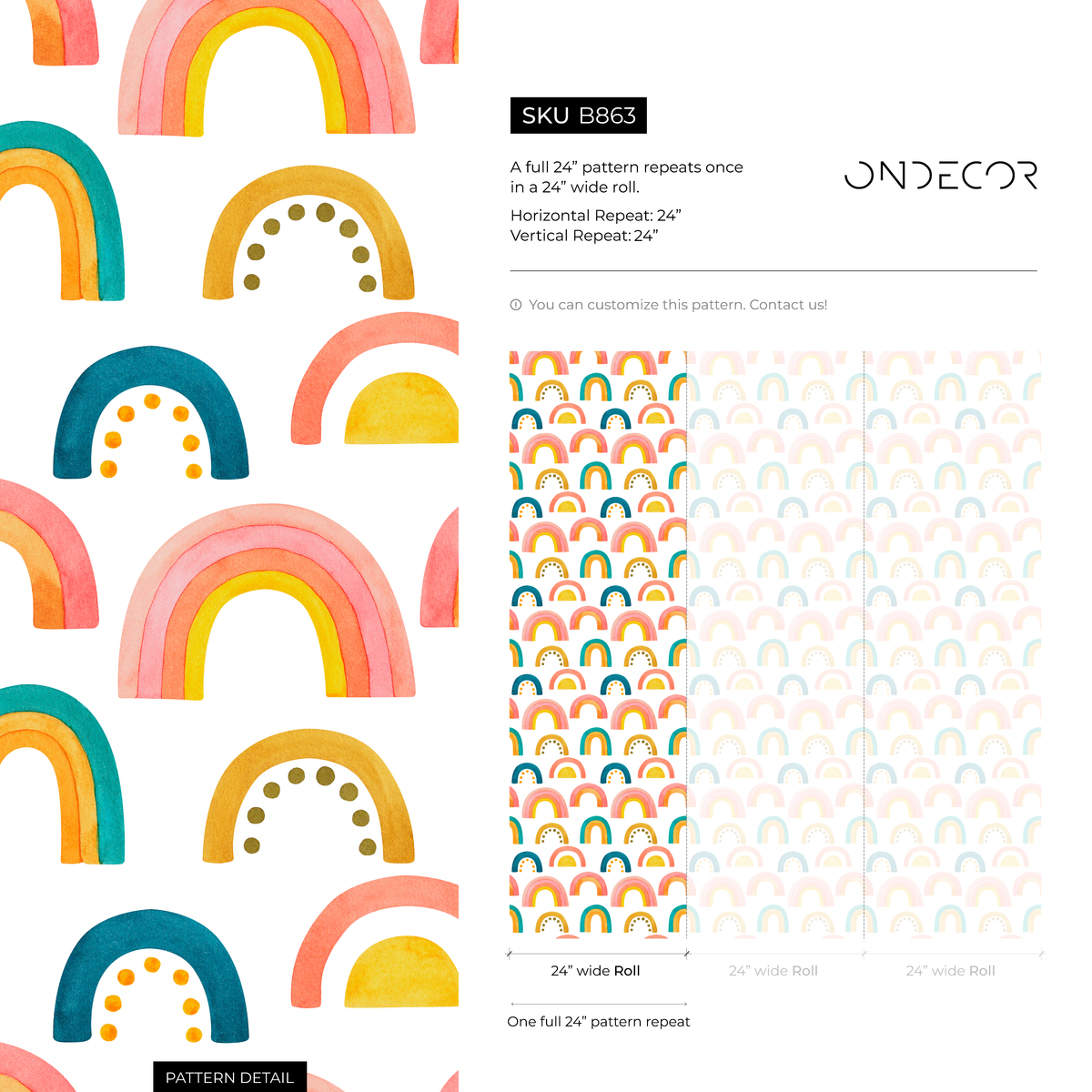 Introduce a touch of cheerful artistry to your home with our Rainbow Wallpaper, featuring a delightful watercolor style. This charming wall decor showcases a pattern of painterly arches in soft pink, sunny yellow, and rich teal, creating a bright and inviting atmosphere. Perfect for transforming a nursery or playroom, this design serves as a stunning piece of wall art that brings warmth and personality to any interior design project.