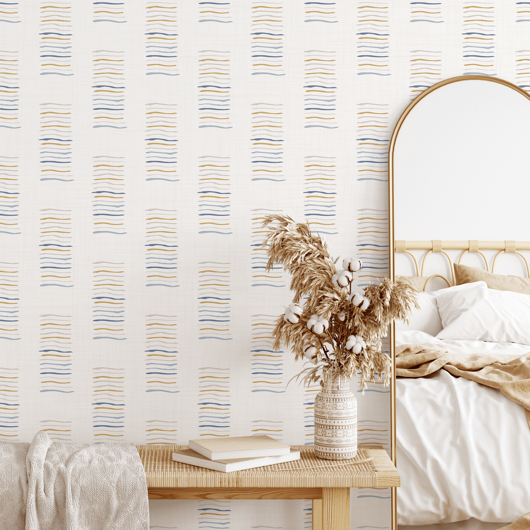Introduce a serene, modern touch to your home with this Scandinavian Wallpaper. Featuring abstract, wavy line blocks in a sophisticated palette of blue, gold, and grey, this design creates a calming and stylish atmosphere. The subtle, textured background adds depth, making it a perfect choice for minimalist or contemporary interior design. This elegant wall art effortlessly enhances any room, providing a clean yet captivating focal point that complements a wide range of home decor styles.