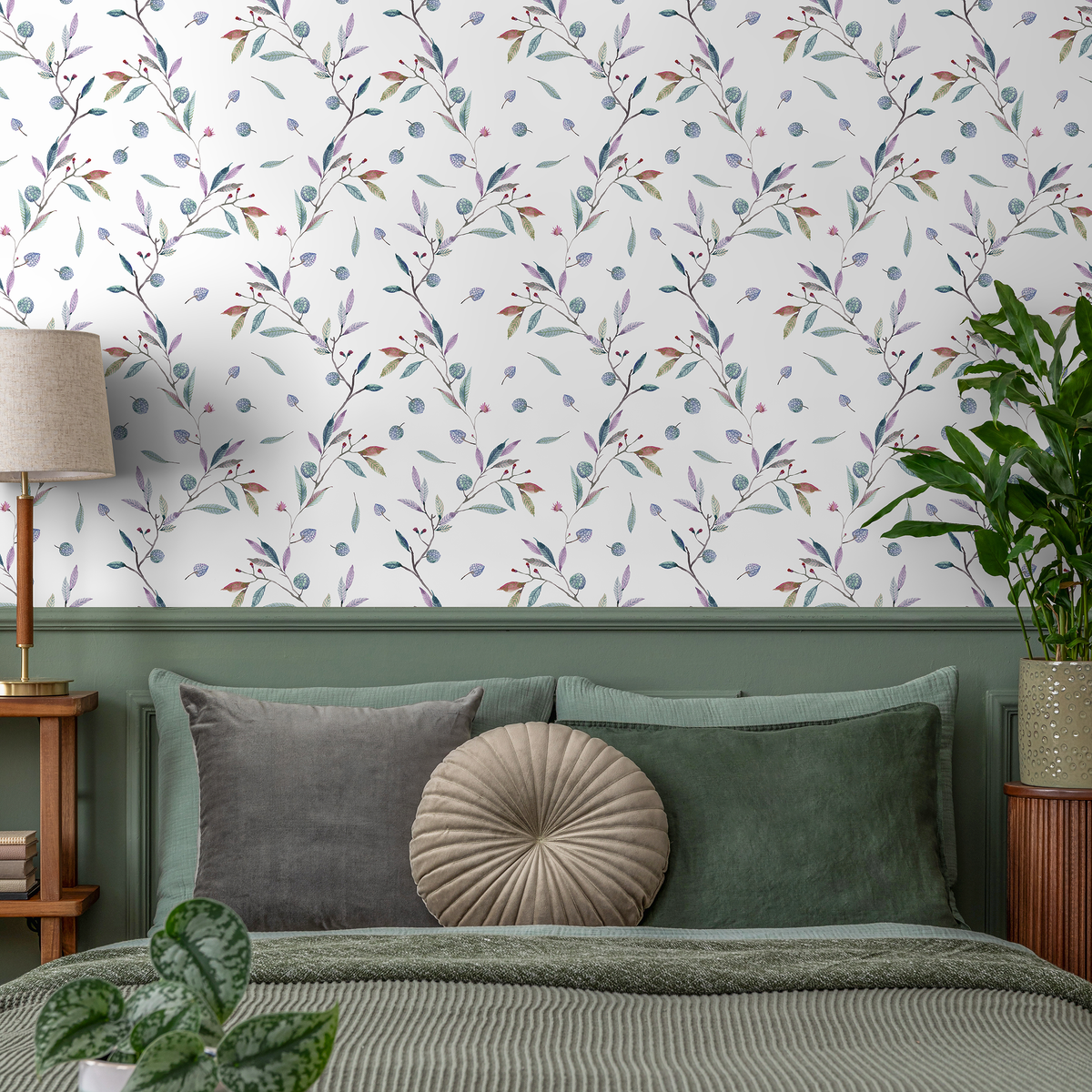 Transform your home with our elegant Botanical Wallpaper, featuring delicate watercolor berry branches. This Scandinavian-inspired design showcases a graceful pattern in soft shades of blue, purple, and red, bringing a touch of nature's tranquility to your walls. It's the perfect choice for creating a serene and sophisticated atmosphere in any room.