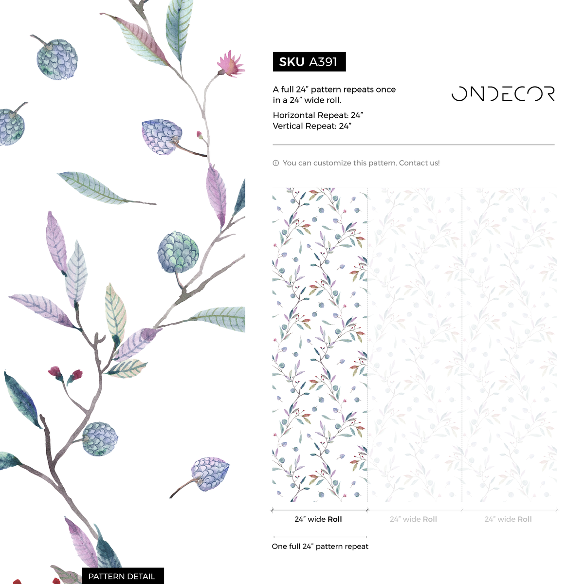 Botanical Wallpaper with Watercolor Berry Branches in Blue, Purple, and Red - A391