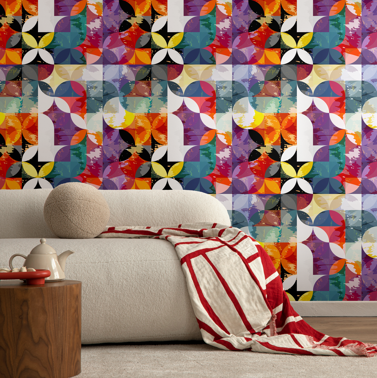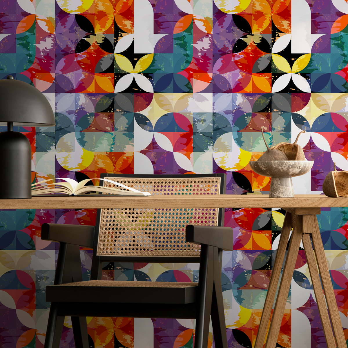 Introduce a bold and artistic statement into your home with this Geometric Wallpaper. Featuring a dynamic distressed circle motif, this design bursts with vibrant shades of orange, purple, and teal, creating a captivating visual texture. This colorful wall art is perfect for anyone looking to infuse their space with energy and modern style, instantly transforming a plain wall into a stunning focal point.
