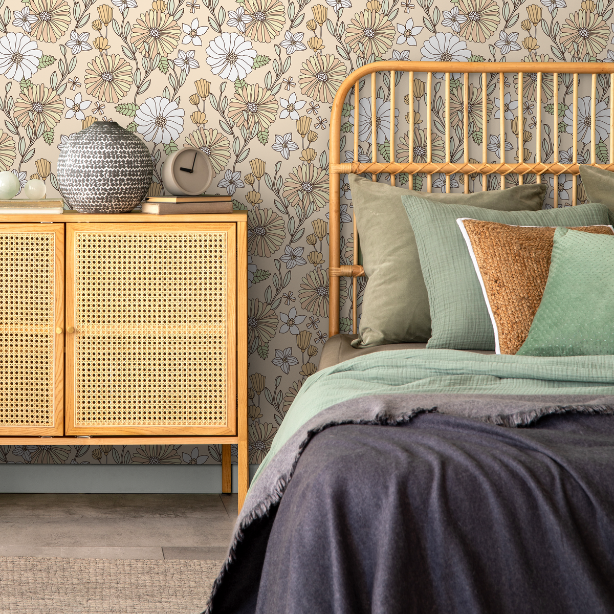 Embrace a touch of nostalgia with our Retro Floral Wallpaper, featuring a charming pattern of stylized daisies. This peel and stick wallpaper captures a classic vintage aesthetic with its delightful design in soft shades of yellow, green, and white. Perfect for creating a feature wall or decorating an entire room, this wall art instantly adds warmth and personality to your interior design, evoking the free-spirited energy of 70s-inspired decor.