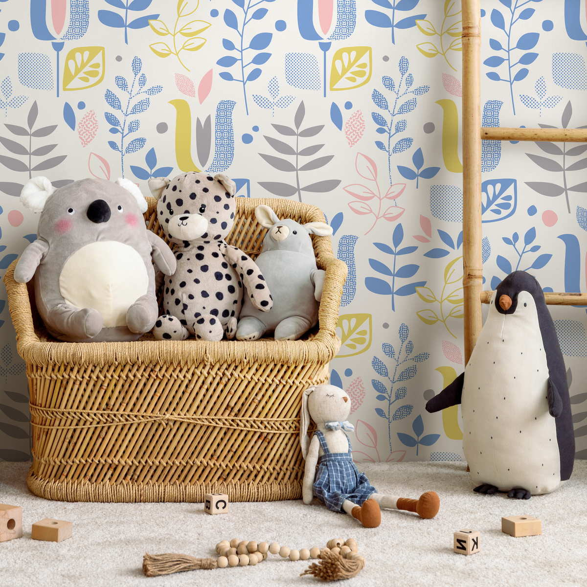 Introduce a touch of Nordic charm with our Scandinavian Wallpaper, beautifully designed with abstract leaves and florals. The delightful color palette of blue, yellow, and pink on a soft background creates a serene and stylish atmosphere, perfect for transforming any interior space. This botanical-inspired wall art is an ideal choice for creating a captivating accent wall or decorating an entire room, seamlessly blending modern design with a whimsical, natural feel.