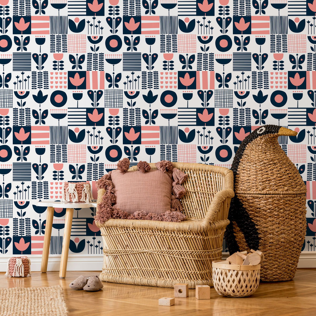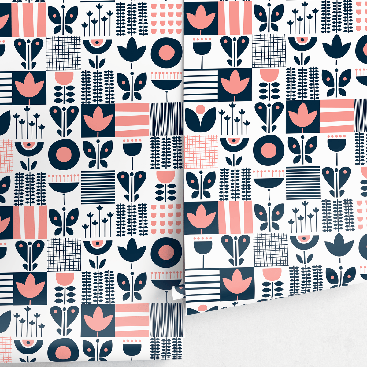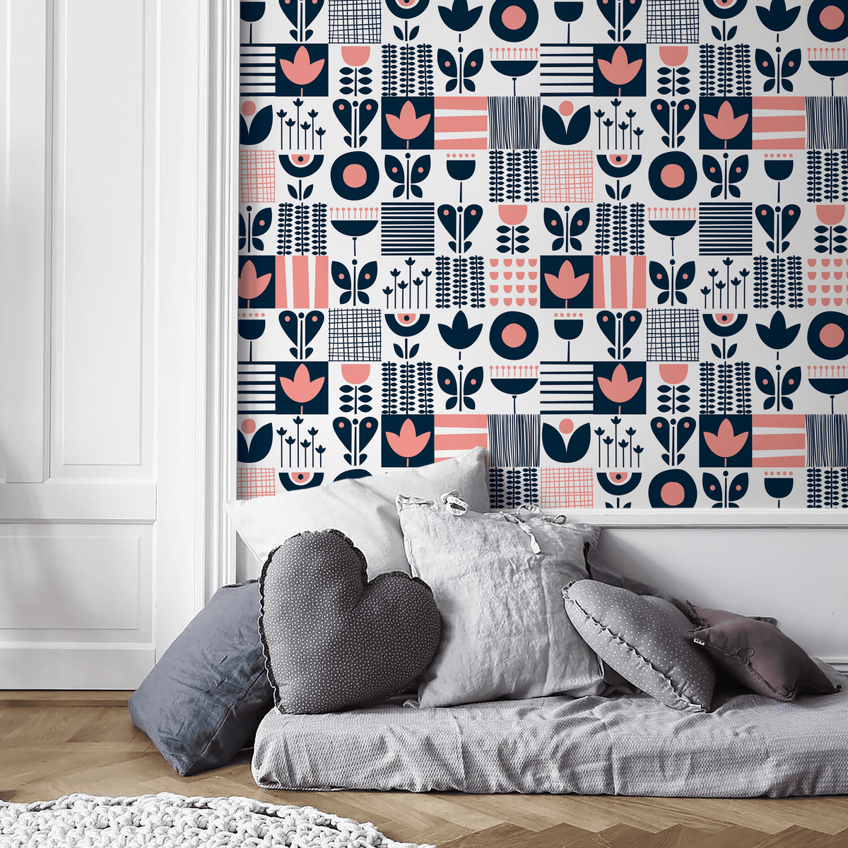 Introduce a touch of Nordic charm with our Scandinavian Wallpaper, featuring a delightful folk art patchwork. This peel and stick wallpaper showcases a captivating grid of stylized floral and geometric motifs in a sophisticated palette of navy blue and pink against a clean white background. Perfect for creating a modern yet whimsical atmosphere, this design serves as stunning wall art that elevates your interior design. The intricate patterns and balanced colors make it an ideal choice for a feature wall or a complete room transformation, bringing a unique and artistic flair to your home decor.