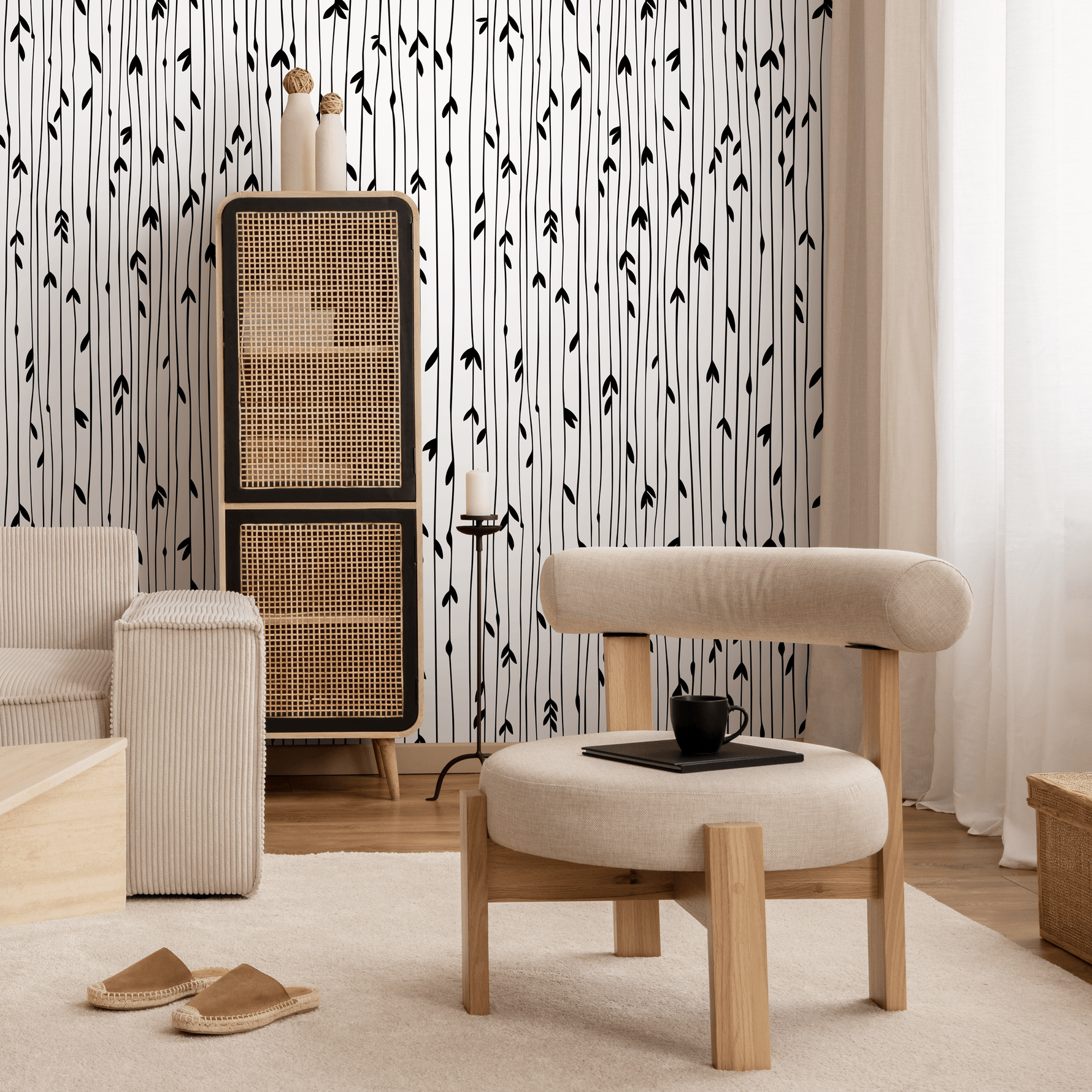 Introduce a touch of serene sophistication with our Scandinavian Wallpaper, featuring a minimalist design of hand-drawn leafy stems. This stunning black and white wall art brings a clean, organic feel to any room, perfectly capturing the essence of modern Nordic interior design. The delicate vertical lines create an illusion of height, making your space feel more open and airy, while the abstract botanical motif adds a subtle yet captivating focal point. Ideal for creating a chic accent wall or decorating an entire room, this wallpaper is a timeless choice for contemporary home decor.