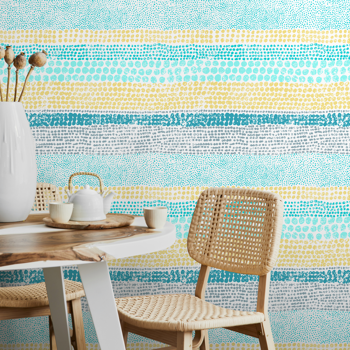 Scandinavian Wallpaper with a Striped Dot Motif in Blue, Yellow, and Gray - A830