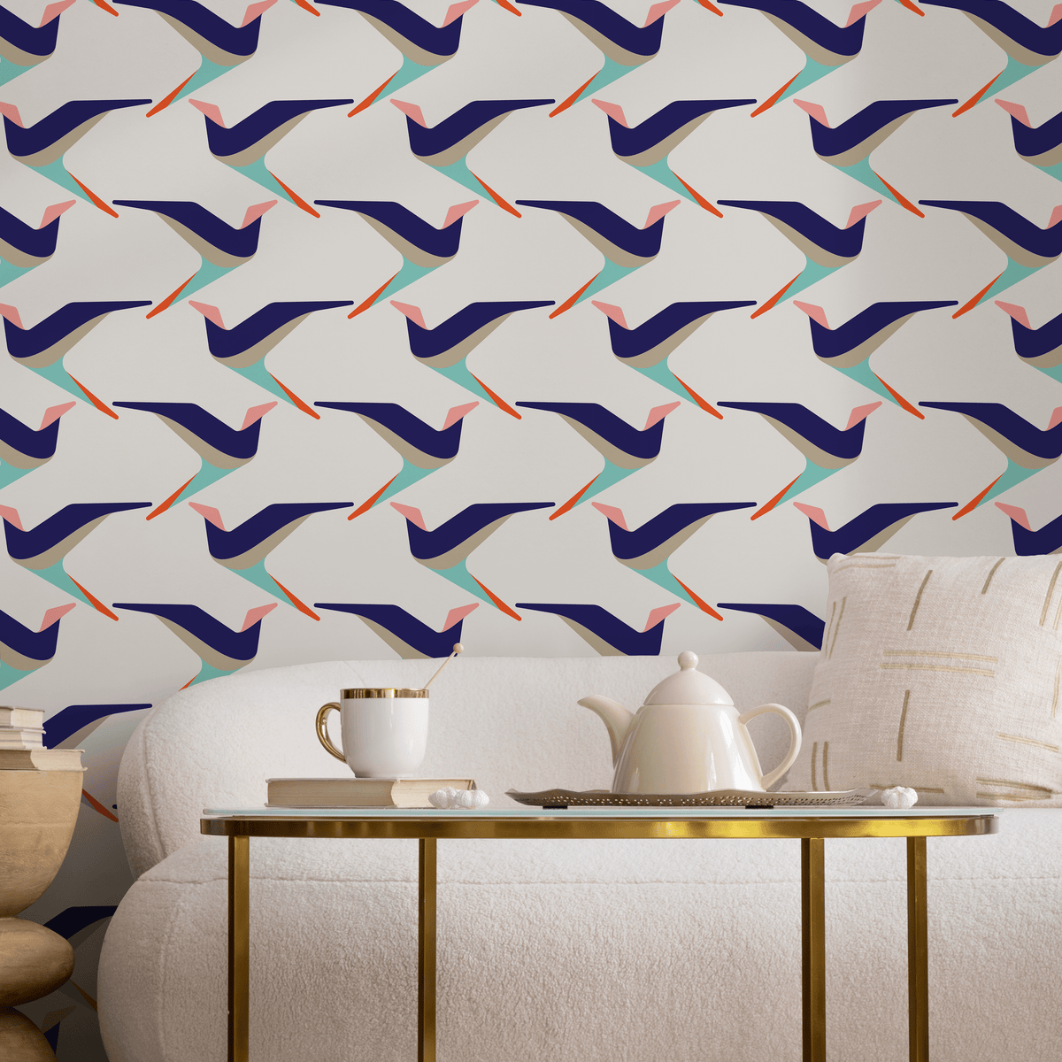 Scandinavian Wallpaper with a Stylized Bird Motif in Blue, Teal, and Orange - B283