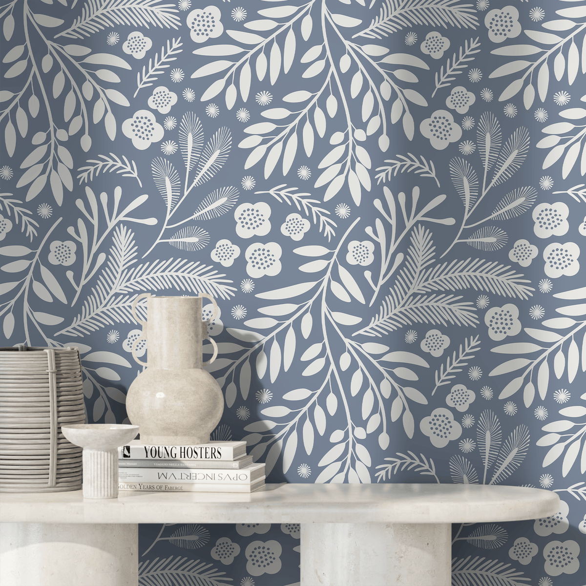 Introduce a sense of calm and nature to your home with this Scandinavian Wallpaper. Featuring a beautiful botanical motif of stylized leaves and blooms in a serene blue and white color palette, this design brings a touch of folk art elegance to any interior. The minimalist yet detailed pattern is perfect for creating a sophisticated accent wall or transforming an entire room with its tranquil aesthetic. This wall art is designed to complement a clean, modern, or nature-inspired home decor style.