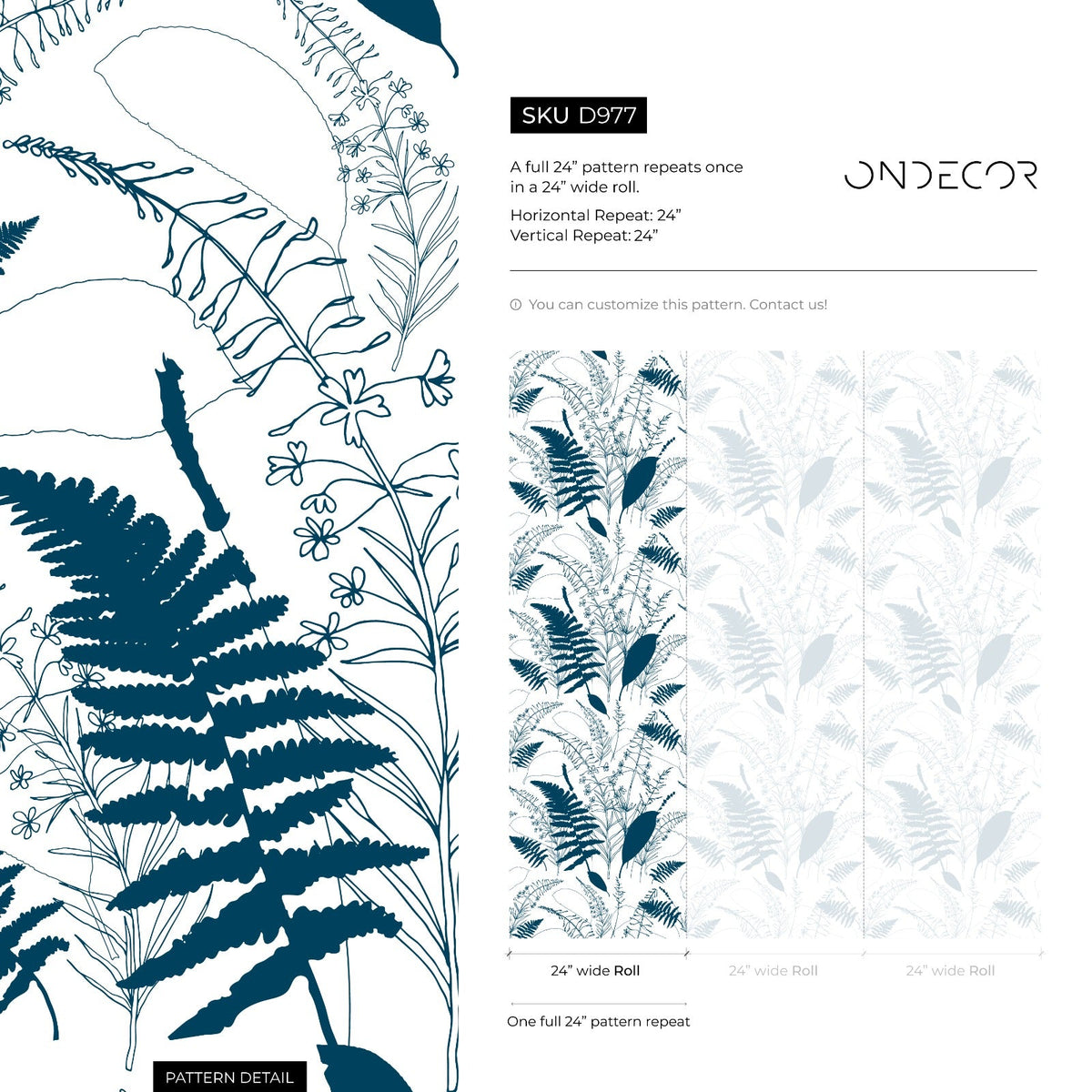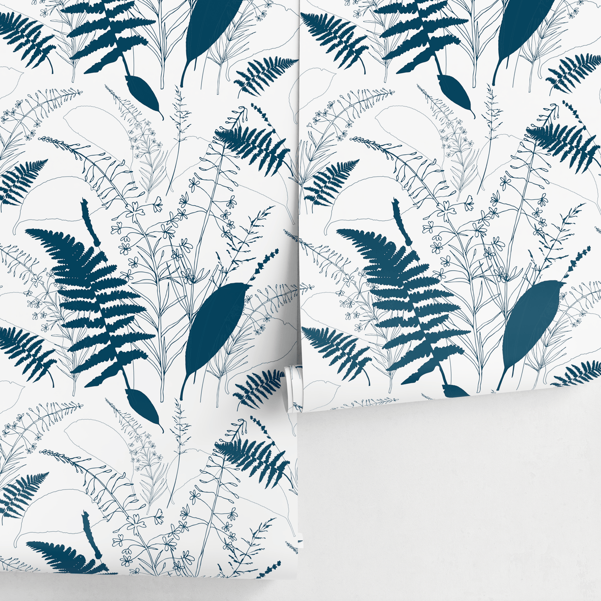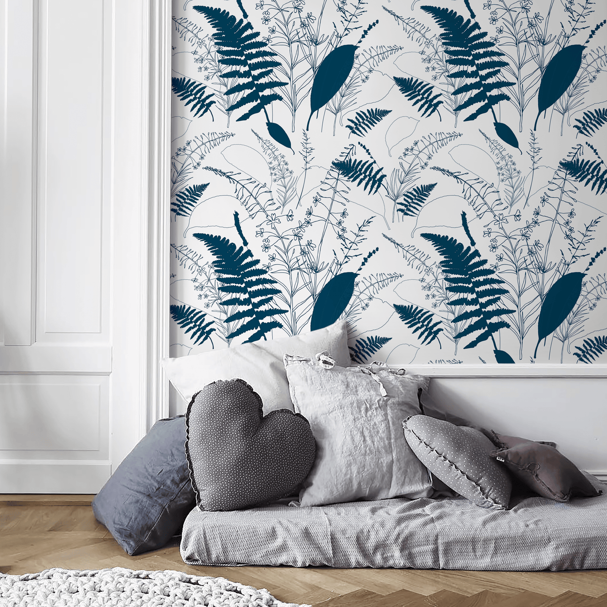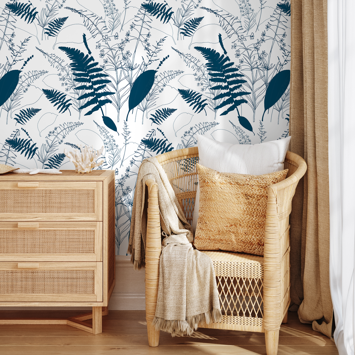 Introduce a touch of serene nature into your home with our Scandinavian Wallpaper, featuring a delicate wildflower and fern motif. The elegant navy blue botanicals, rendered in a mix of graceful line art and solid silhouettes, create a tranquil and sophisticated atmosphere. This design is perfect for anyone looking to incorporate minimalist, nature-inspired wall art into their interior design, adding a clean and refreshing aesthetic to any room.