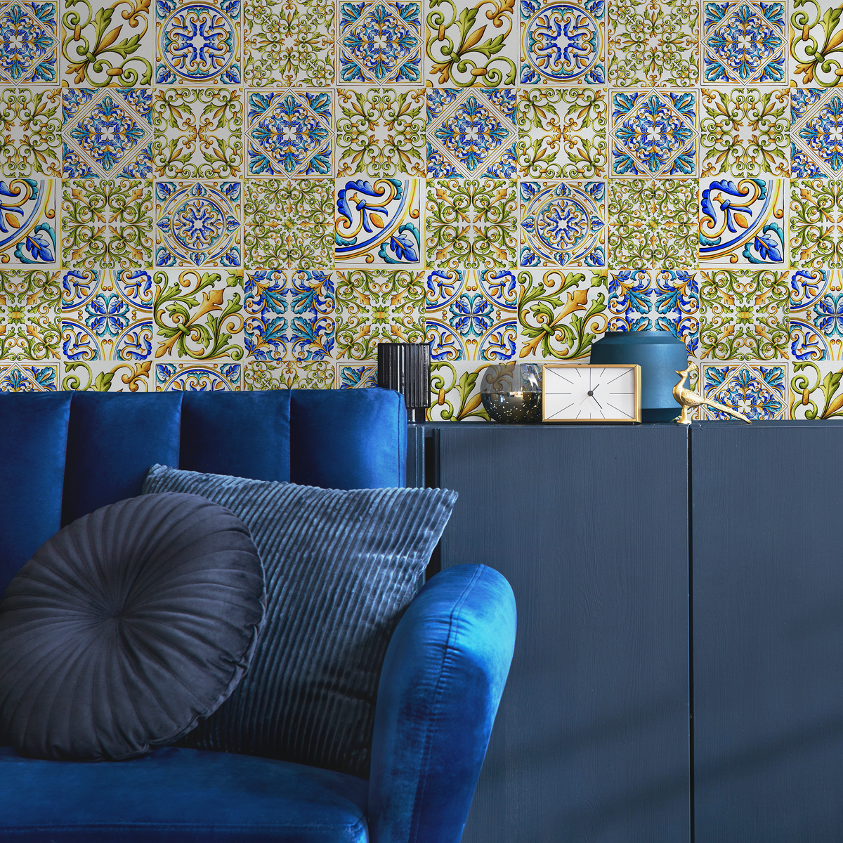 Infuse your home with worldly charm using our Tile Wallpaper, featuring a stunning Mediterranean Arabesque motif. This vibrant wall art captures the intricate beauty of traditional tilework in a rich palette of blue, green, and yellow, instantly creating a focal point in any room. Perfect for achieving a high-end tile look without the cost or commitment, this design brings an eclectic and sophisticated energy to your interior design. It’s an ideal choice for a kitchen backsplash, a unique bathroom accent, or a lively living room feature wall.