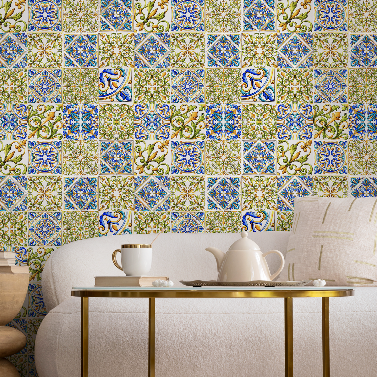 Tile Wallpaper with a Mediterranean Arabesque Motif in Blue, Green, and Yellow - C340