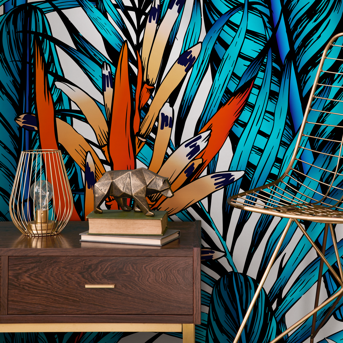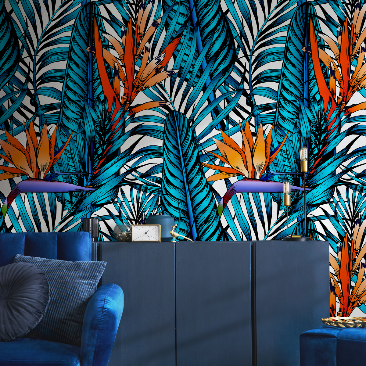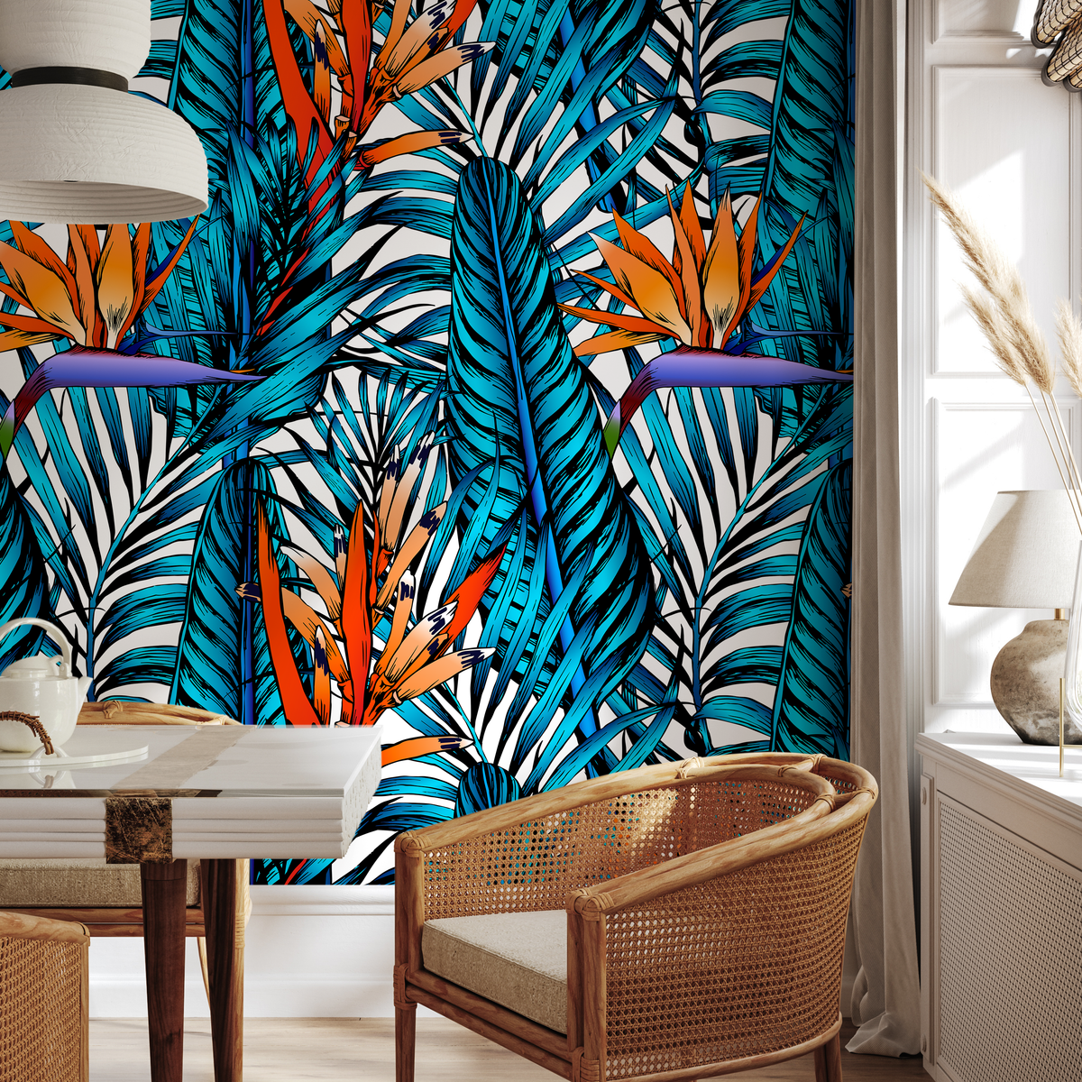 Immerse your space in a vibrant island escape with this stunning Tropical Wallpaper. Featuring bold Birds of Paradise flowers and lush palm leaves, this design brings a dramatic touch of nature indoors. The striking color palette of vivid blue, orange, and purple creates a captivating wall art statement, perfect for anyone looking to infuse their home decor with energy and style.