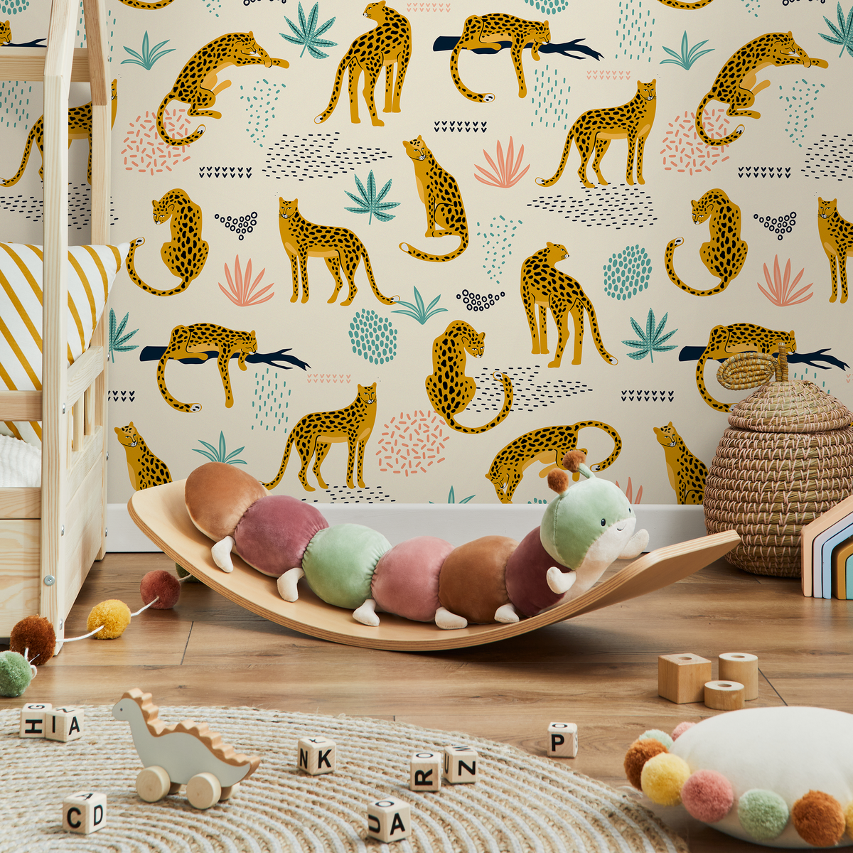 Unleash your wild side with our Tropical Wallpaper, featuring a playful pattern of stylized leopards and abstract botanicals. This captivating wall art, rendered in a modern palette of yellow, teal, and pink, brings a fun and sophisticated jungle theme to any room. Perfect for creating a stunning accent wall, this animal wallpaper adds a touch of personality and charm to your home decor, instantly transforming your space into a vibrant, contemporary oasis.