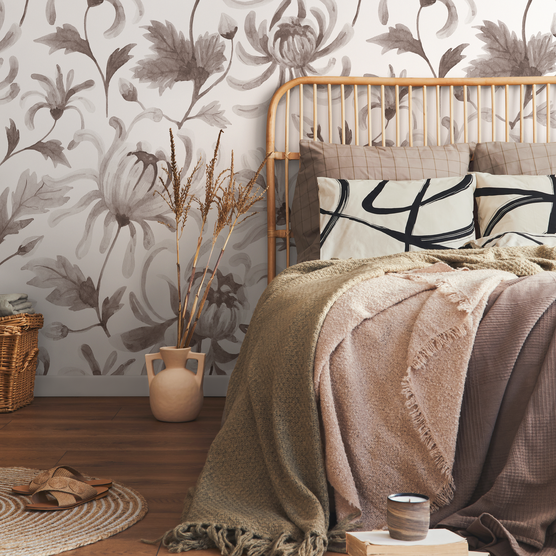 Transform your interior design effortlessly with our versatile wallpaper options. Available as a user-friendly peel and stick wallpaper, it's perfect for DIY enthusiasts and renters seeking a temporary yet impactful change. The removable wallpaper ensures a damage-free application and removal process. This gray and taupe floral wall art complements a wide range of styles, from modern farmhouse to traditional, making it a flexible choice for your living room, bedroom, or nursery decor.