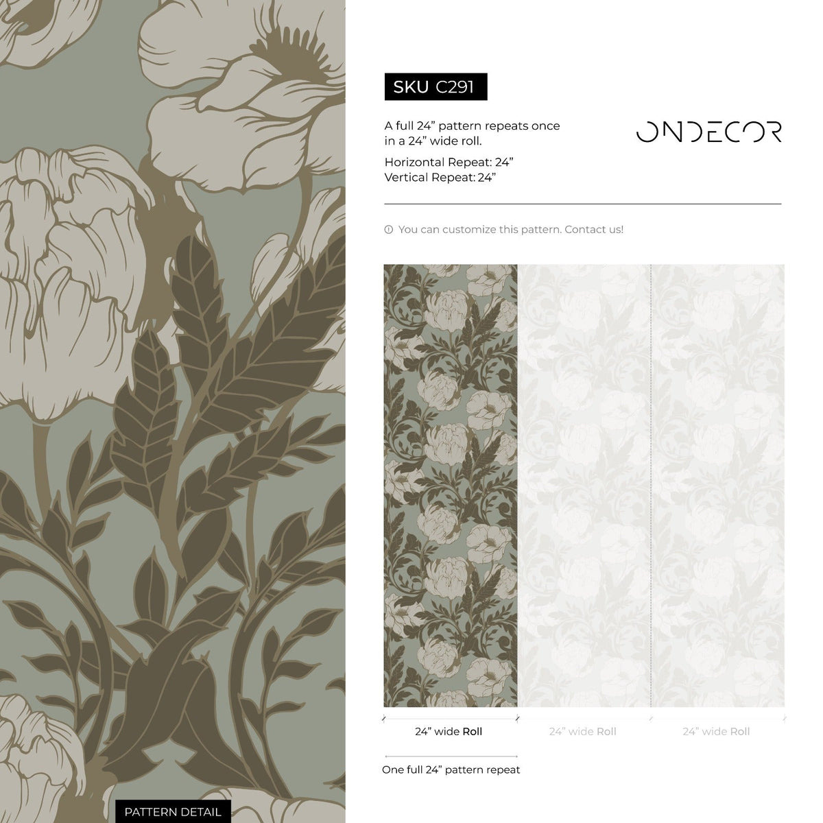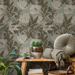 Vintage Floral Wallpaper with Elegant Peonies in Sage Green and Brown - C291