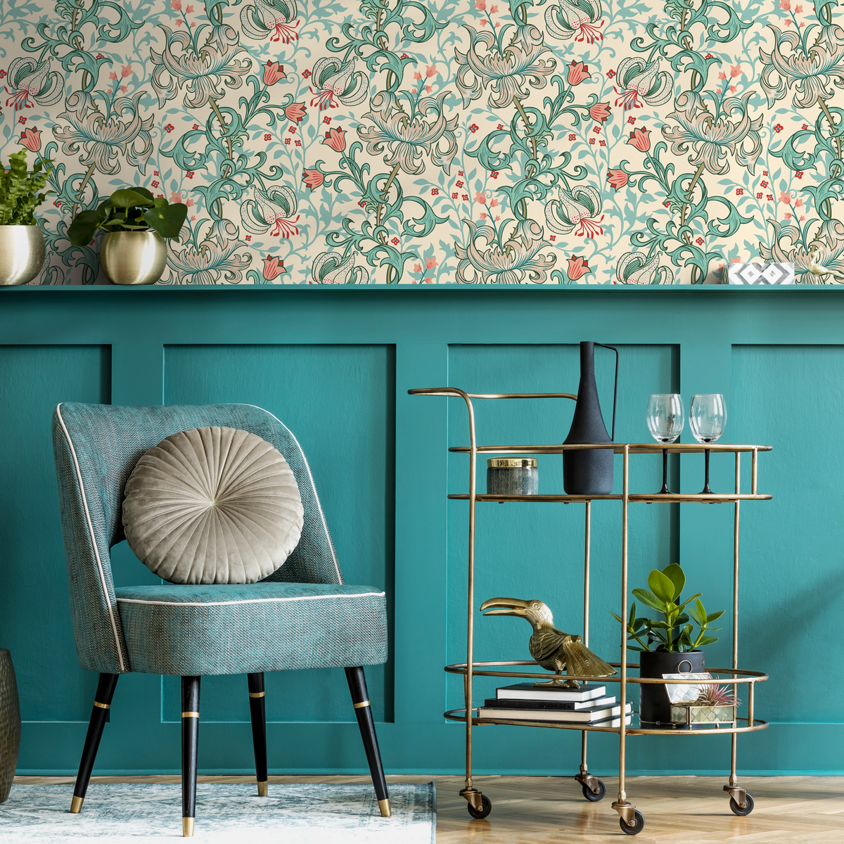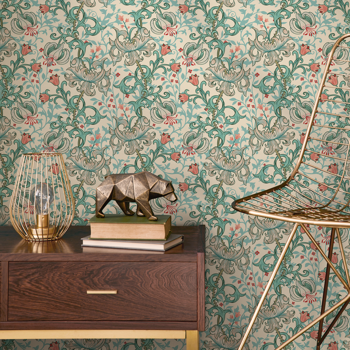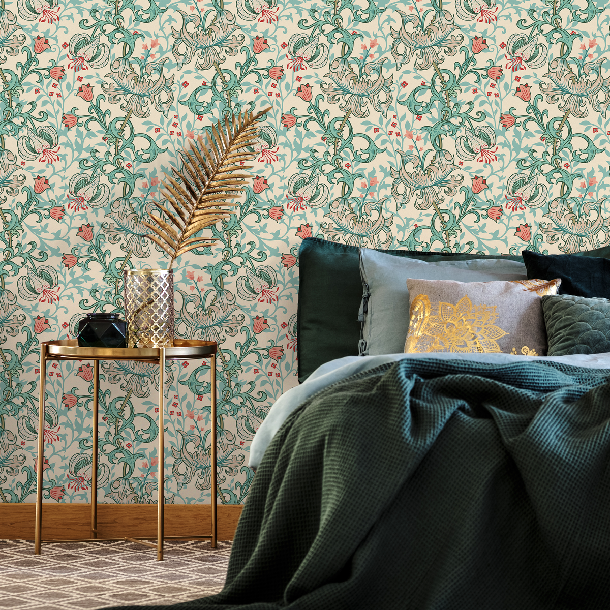 Introduce timeless elegance to your home with our Vintage Floral Wallpaper, featuring a classic lily motif in rich teal, warm coral, and soft cream. This Arts and Crafts-inspired design is perfect for creating sophisticated wall art that elevates your interior design. The intricate pattern of swirling vines and blooming lilies brings a touch of nature's grace indoors, making it an exceptional choice for home decor.