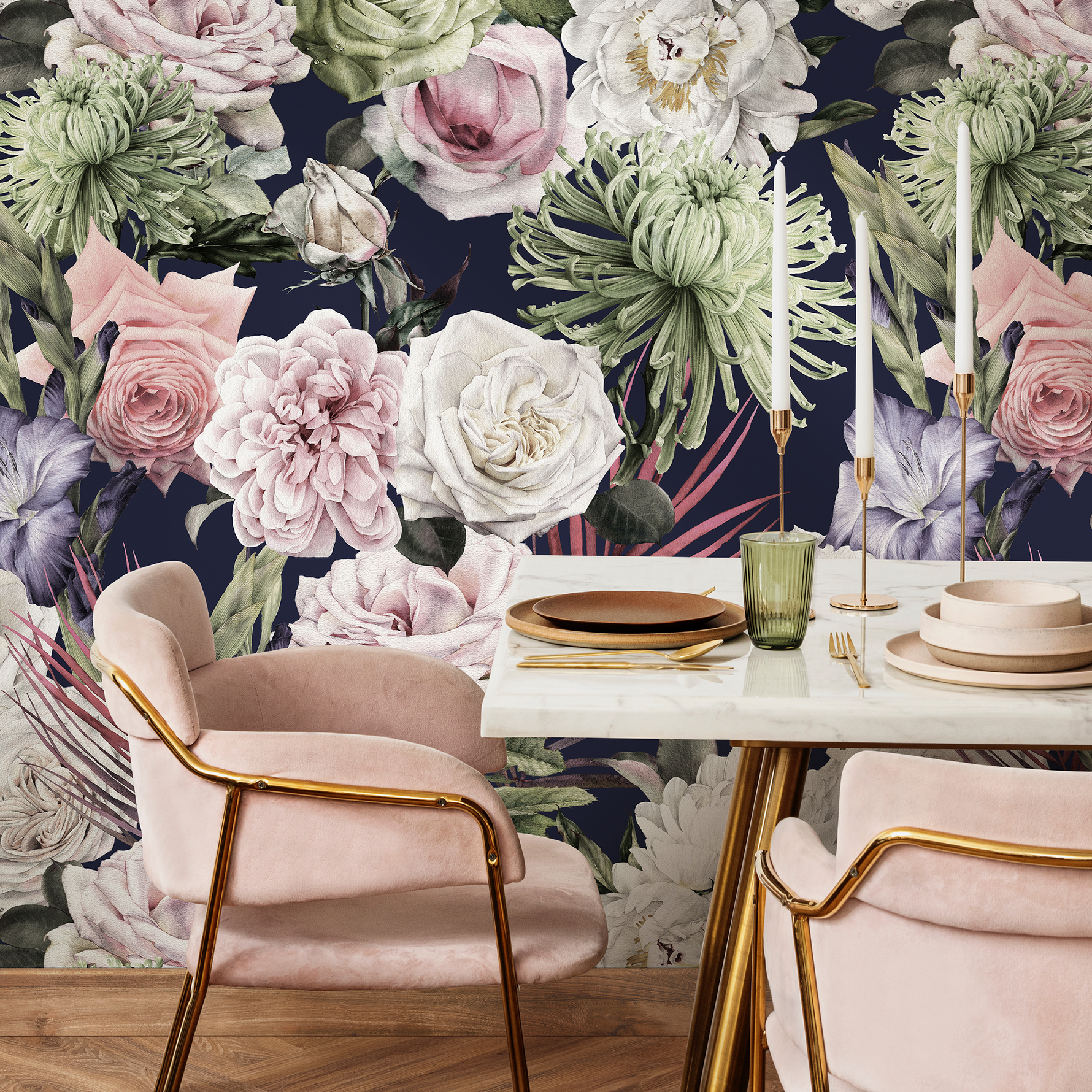 Introduce timeless elegance to your home with this Floral Wallpaper, featuring a dramatic bouquet of roses and peonies. The lush arrangement in sophisticated shades of navy, pink, and green creates a captivating and moody ambiance, making it a stunning piece of wall art. This design is perfect for anyone looking to infuse their interior design with a touch of vintage romance and dramatic flair, instantly transforming any room into a breathtaking floral sanctuary.