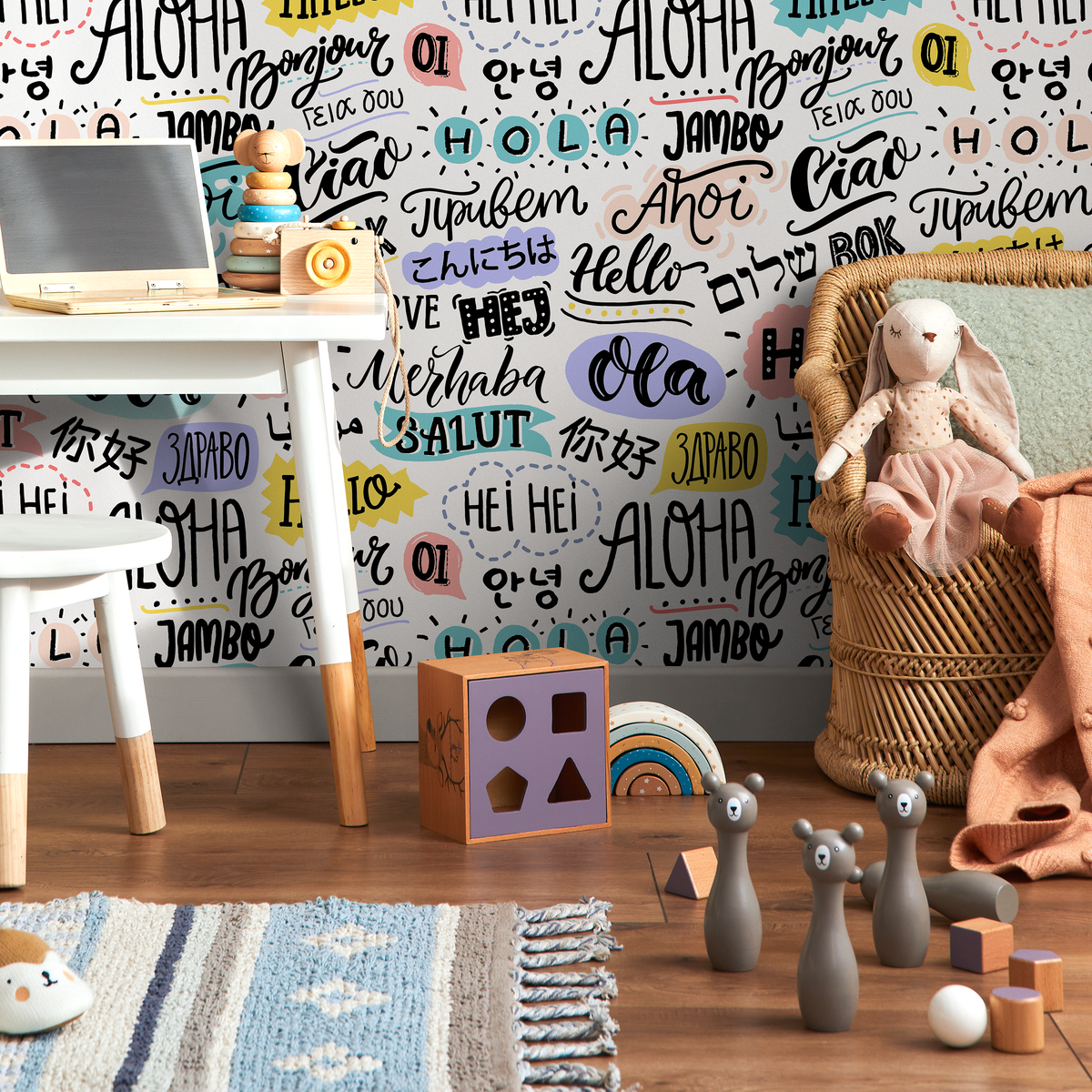 Introduce a world of connection with our Modern Typography Wallpaper, featuring global greetings in a vibrant mix of black, teal, and yellow. This unique wall art is perfect for creating an engaging and educational atmosphere, showcasing words like 'Hello,' 'Bonjour,' and 'Aloha' in stylish, hand-drawn fonts. It's an ideal choice for anyone looking to add a touch of international flair and positive energy to their home decor.